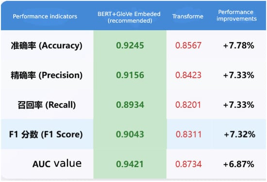 In conclusion, the proposed BERT and GloVe embedding hybrid model, which integrates BERT’s powerful contextual semantic understanding with the stable semantic representations of GloVe’s global word vectors, effectively mitigates the limitations of a standalone Transformer model for this specific task. Its superior and consistent performance across all key metrics—accuracy, precision, recall, F1-score, and AUC—validates its effectiveness and advanced capabilities for online public opinion analysis (Figure 5).