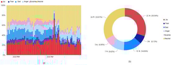As shown in Figure 9b, the overall sentiment distribution demonstrates a relatively balanced pattern among neutral sentiment, negative sentiment (including fear, sadness, and anger), and positive sentiment (joy)—each accounting for approximately 30% of the total corpus. Notably, surprise is treated separately, as it can represent either positive or negative emotions depending on context and thus is not included in either category.