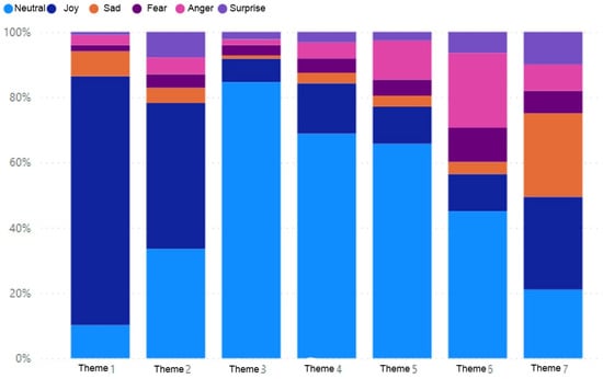 To further understand how netizens’ emotions evolve under different circumstances and to enable more targeted public opinion guidance and governance, this study conducted a more granular analysis of sentiment under the seven main topics and three core hot themes. Different topics represent different emotional releases, and netizens express significantly varied emotions depending on the subject matter. As shown in Figure 10, the emotional differences across topics are evident:
