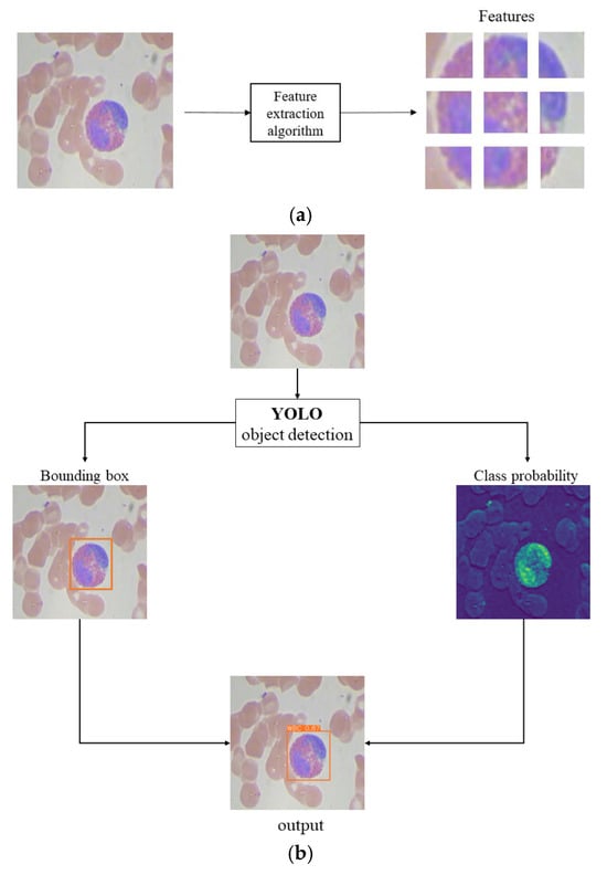 (a) Feature extraction of blood cell (b) YOLO-BC’s bounding box and class probability for detected blood cell.