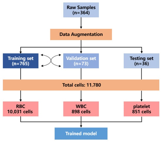 Through data augmentation, a more comprehensive blood cell dataset is generated, ensuring a broader representation of the blood cell detection scenario. The final dataset includes a training set (765 images), a validation set (73 images), and a test set (36 images). Although the number of test images is limited, each image contains a large number of blood cells, providing a relatively rich sample size.