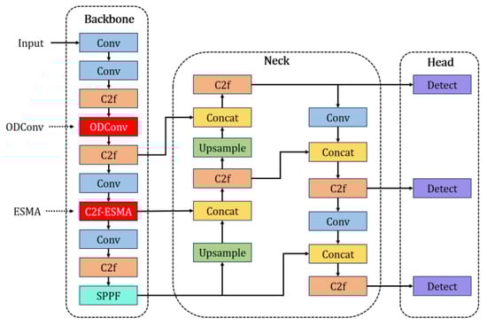 Based on the YOLOv8 model [], incorporating the aforementioned EMSA and ODConv, this study designed and implemented an improved network architecture called YOLO-BC (YOLOv8 for Blood Cell), as illustrated in the Figure 3 below.