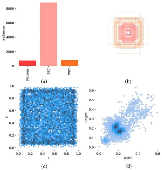As is shown in Figure 6, within the BCCD dataset used for training, there are a total of 739 platelet instances, 8814 red blood cell instances, and 789 white blood cell instances (Figure 6a). Furthermore, normalized statistics were computed for the positions of the detection bounding boxes, scaling their coordinates to a range between 0 and 1. Analysis reveals that the dimensions (length and width) of the detection boxes are predominantly concentrated around the 0.2 mark. In this context, the x- and y-axes in Figure 6c represent the relative positions of the detection boxes within the blood cell dataset, with values being unitless, while the width and height axes in Figure 6d illustrate the relative sizes of the bounding boxes. These normalized statistics provide a more consistent and scalable representation of object locations and dimensions, improving model performance.