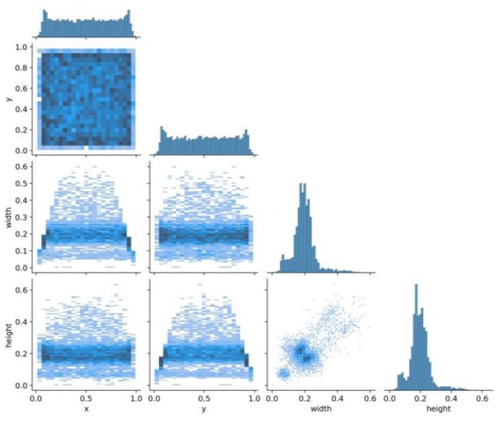 Label correlograms are an effective tool for identifying spatial patterns or correlations within blood cell object annotations, particularly in datasets containing multiple classes and scales. This technique enables the detection of instances where certain classes exhibit significant co-occurrence within an image, or where specific classes are more frequently observed at particular scales. The following figure shows a label correlation plot for a blood cell dataset, visualized in the xywh space (Figure 7). This plot illustrates the relationships between the x, y coordinates, as well as the width and height variables of the detection bounding boxes for each label. Additionally, the size distribution of the blood cell dataset is relatively well-balanced, making it more conducive to training robust models. This balanced distribution of object sizes ensures that the model learns to detect cells of varying dimensions, enhancing its performance across different scenarios.