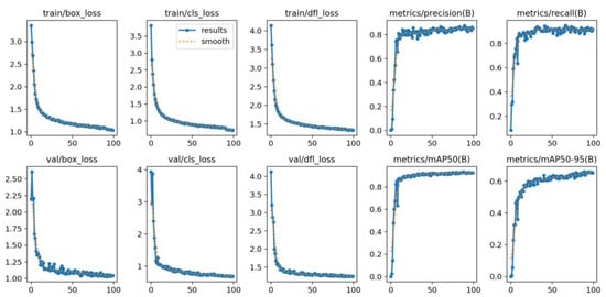 YOLO-BC Model Training (The loss function is formulated to measure the discrepancy between the model’s predictions and the ground truth, incorporating key components such as box loss, classification loss, and distribution focal loss. A reduced loss value signifies enhanced model robustness and greater flexibility in adapting to data variations. The reported results include the raw values of various training metrics, while the “smoothed” values reflect the metrics after applying a smoothing trick, offering a more refined and consistent representation of the overall training trajectory. This smoothing process helps to mitigate fluctuations and provides a clearer view of the model’s performance evolution throughout the training process).