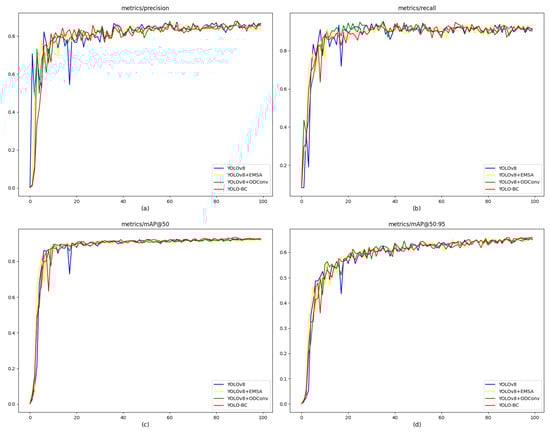The training results of models based on YOLOv8 ((a) precision curve of models from YOLOv8 to YOLO-BC; (b) recall curve of models; (c) mAP@50 curve of models where iou threshold is 0.5; (d) mAP@50:95 curve of models, iou threshold is 0.5–0.95).