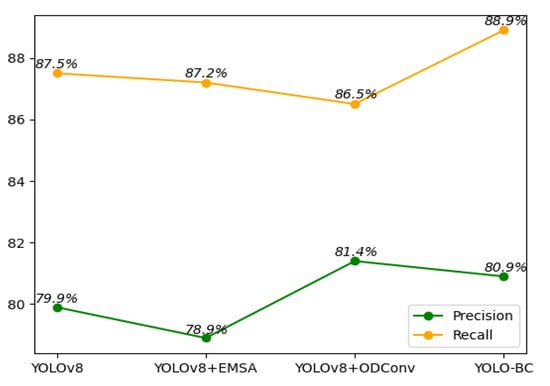 To provide a more intuitive evaluation of the proposed algorithm’s performance, we present the detection results of both YOLOv8 and YOLO-BC on the test dataset (Figure 14).
