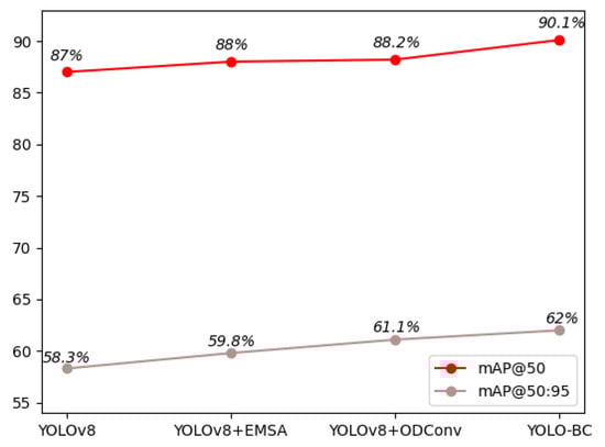 In the ablation experiment conducted on the new BCDv4 testing dataset, the YOLO-BC model proves notable advantages after improvements, as is shown in Table 4. YOLO-BC achieves the highest performance with a Precision of 92.7%, Recall of 90.6%, and a mAP@50 of 0.939, surpassing all other models in terms of both mAP@50 and overall detection accuracy. It also strikes an optimal balance between computational efficiency and performance, with 3,062,116 parameters and 8.0 GFLOPs, offering a competitive FPS of 6.48.