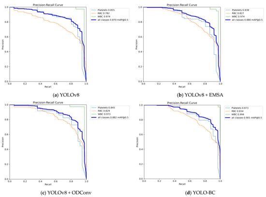 The results reveal that when the IoU threshold is set to 0.5, the YOLO-BC model exhibits a modest improvement over YOLOv8 on the blood cell training dataset (see Figure 9, panels (b), (c), and (d) compared to (a)). However, as the IoU threshold increases, the model demonstrates a marked improvement in mean Average Precision (mAP), although the absolute value remains comparatively lower. Furthermore, both recall and precision metrics show varying levels of enhancement.