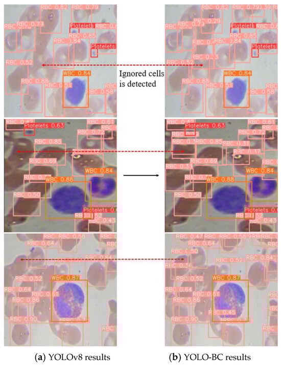 Comparison of predicted results. The improved YOLO-BC can identify some red blood cells missed by yolov8 detection.