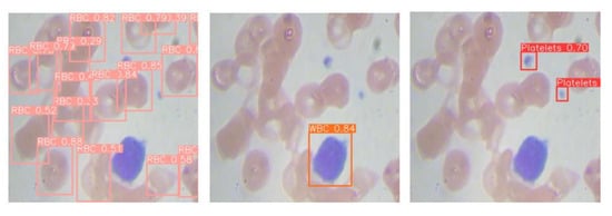 Taking into account the practical requirements of medical professionals for blood cell diagnostics, the YOLO-BC algorithm provides the flexibility to tailor its functionality to specific needs. For instance, in cases where only the detection and quantification of red blood cells (RBCs) is necessary for diagnosing conditions related to RBC abnormalities [,,], the algorithm allows users to adjust the category label to exclusively detect and count RBCs, as shown in Figure 15. This customization feature enables medical personnel to concentrate solely on the blood cell type of interest, minimizing visual distractions that may arise from the simultaneous detection of other cell types. Consequently, this targeted detection capability enhances the efficiency of the diagnostic process by streamlining the focus on relevant cellular features.