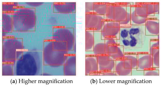 As shown in the Figure 16, with different microscope magnification settings, YOLO-BC can still stably detect blood cells and distinguish their types.
