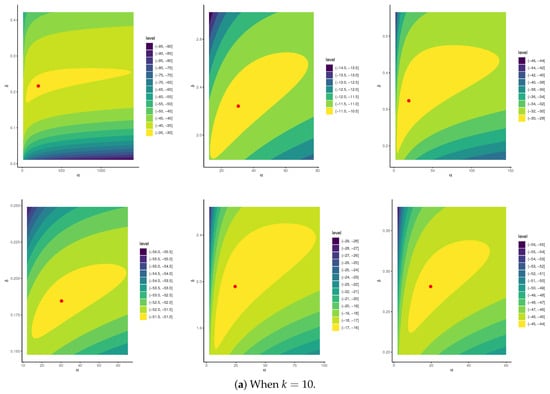 It is essential to investigate the existence and uniqueness of the MLEs for the APE () and BB () model parameters. However, due to the intricate form of the log-likelihood functions (), given in (12) and (16), establishing these properties analytically is intractable. To address this limitation, we simulate a P-FFC-BB sample from APE (2, 1) and BB (1, 1) under the setup . From the simulated data, the estimated MLEs for the APE parameters are obtained as (2.6456, 0.6637), while the BB parameters are estimated as (0.0194, 0.1266). Figure 2 presents the likelihood contours of and , which clearly demonstrate that the proposed MLEs, and , both exist and are unique.