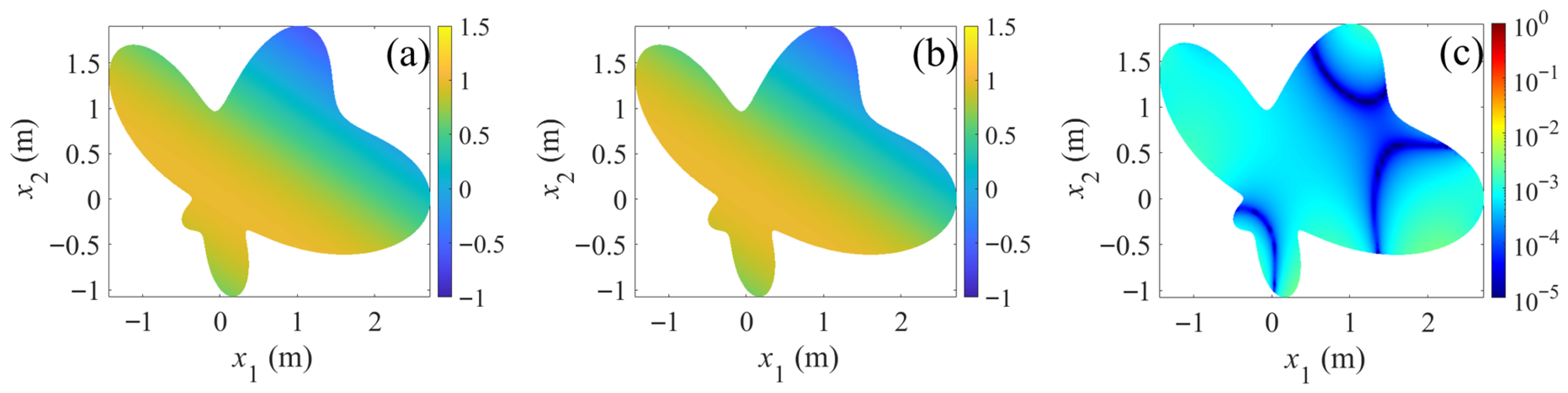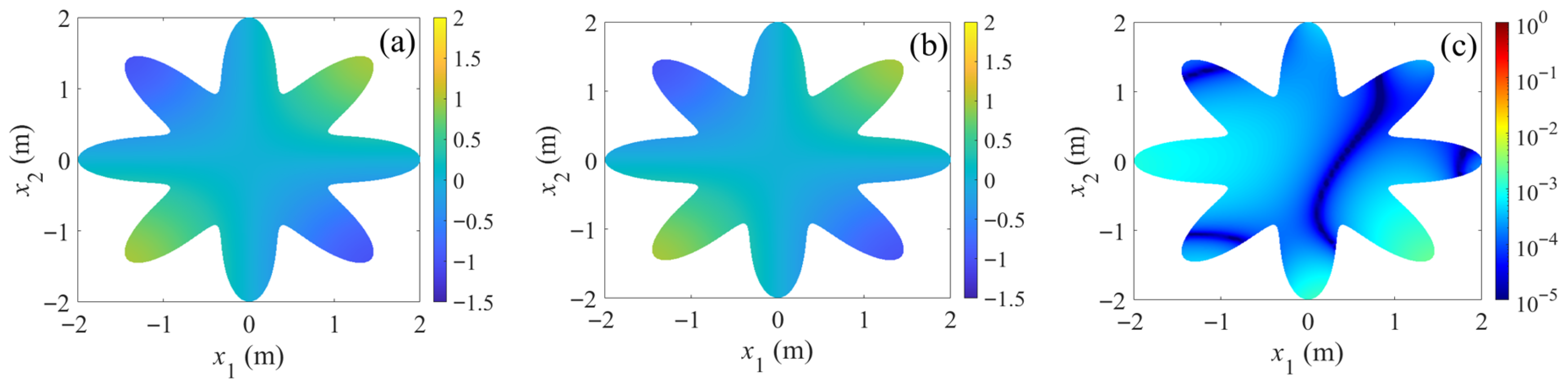 By using the non-singular general solution in Equation (8) as the radial basis function, the numerical solution of Equation (1) can be represented by