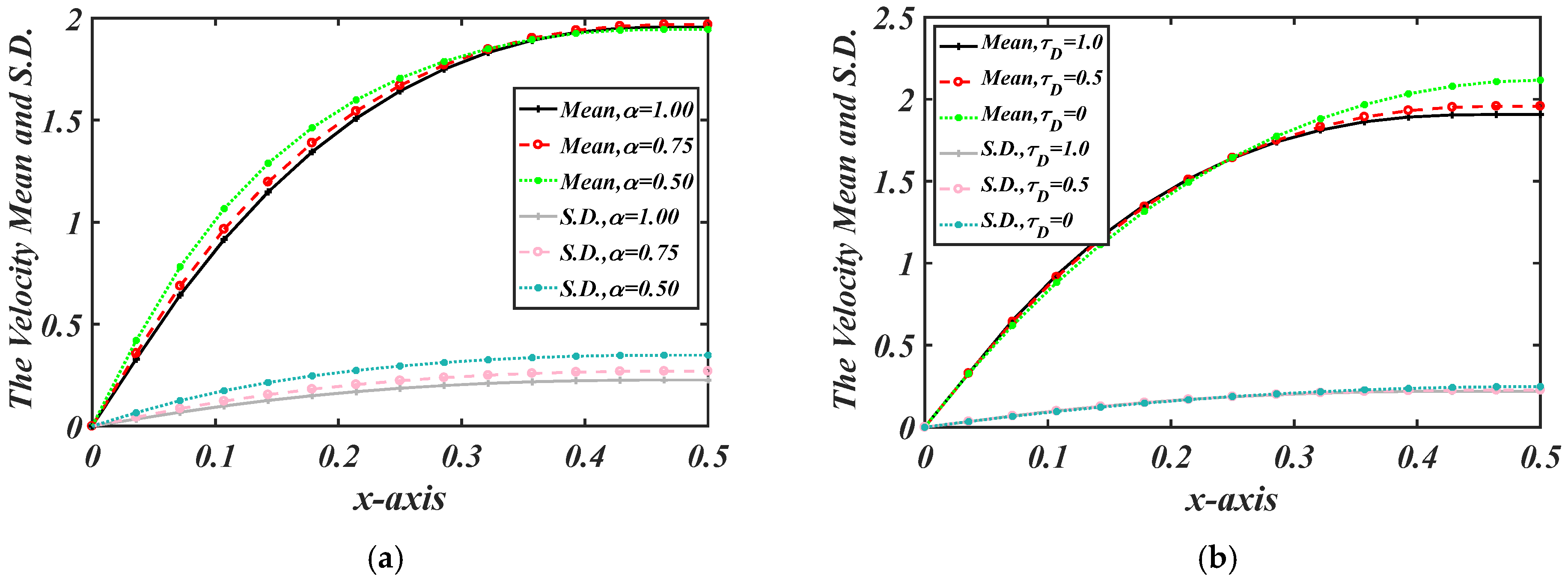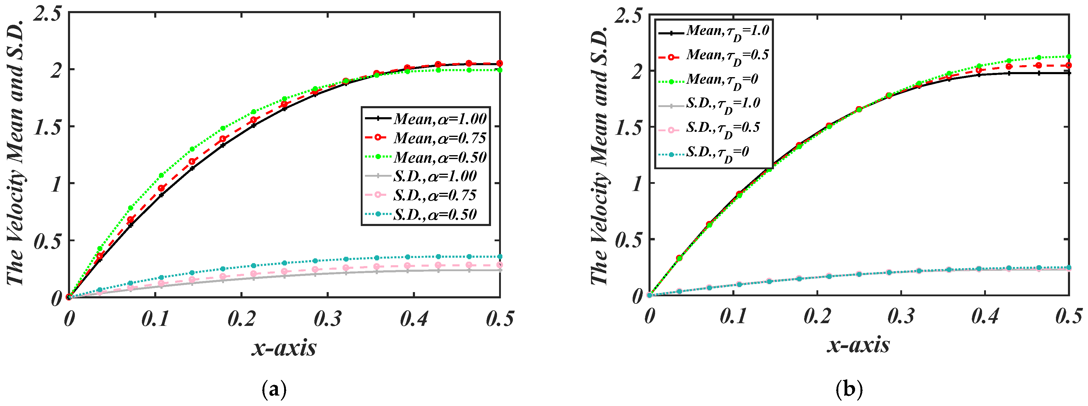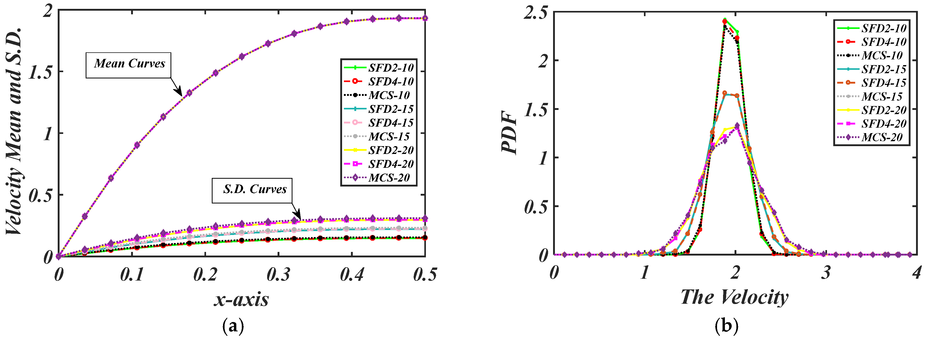 - Galal, O.H. Stochastic velocity modeling of magneto-hydrodynamics non-Darcy flow between two stationary parallel plates. Alex. Eng. J. 2021, 60, 4191–4201. [Google Scholar] [CrossRef]