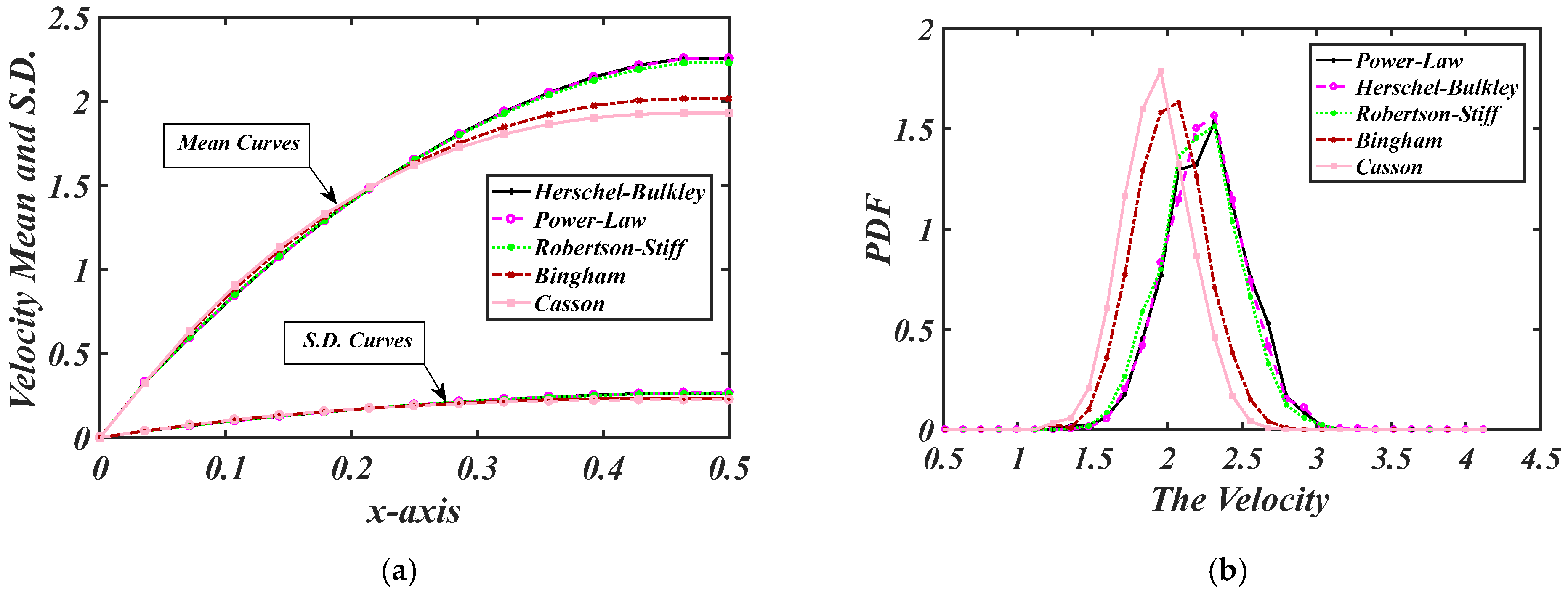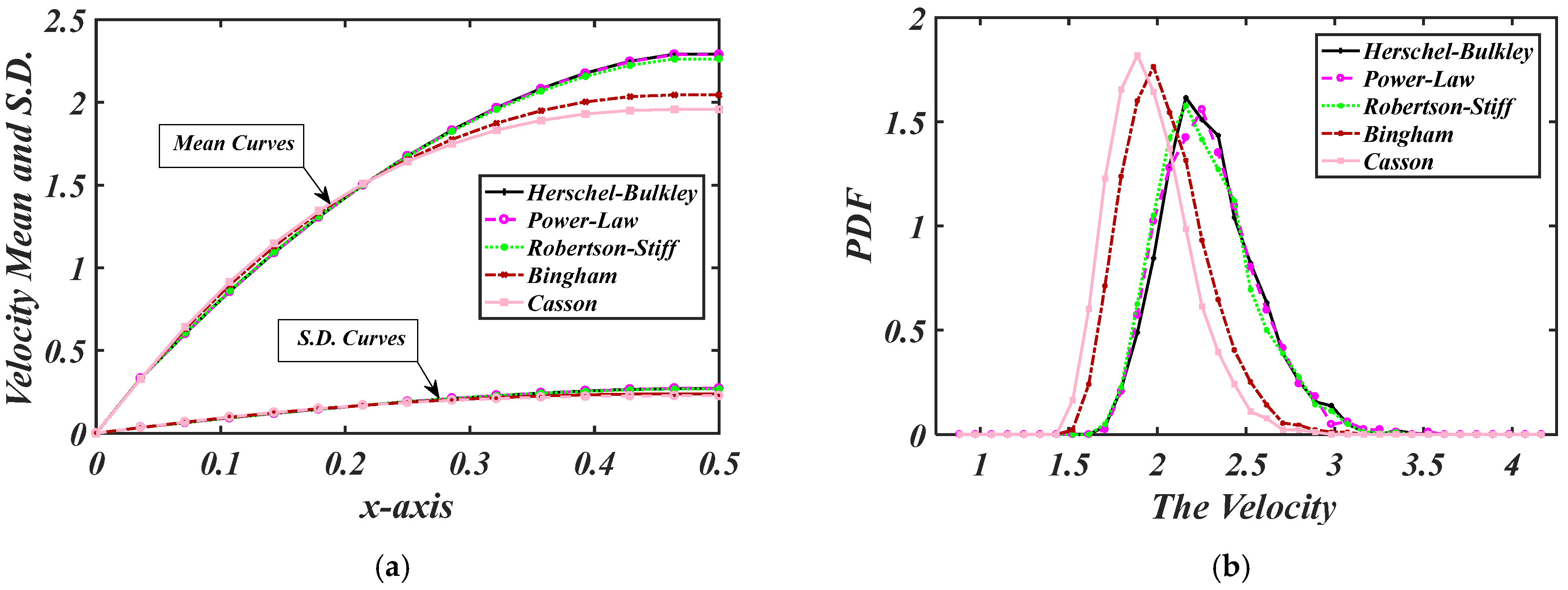 5.3. Comparative Stochastic Analysis of Five Non-Newtonian Fluid Models