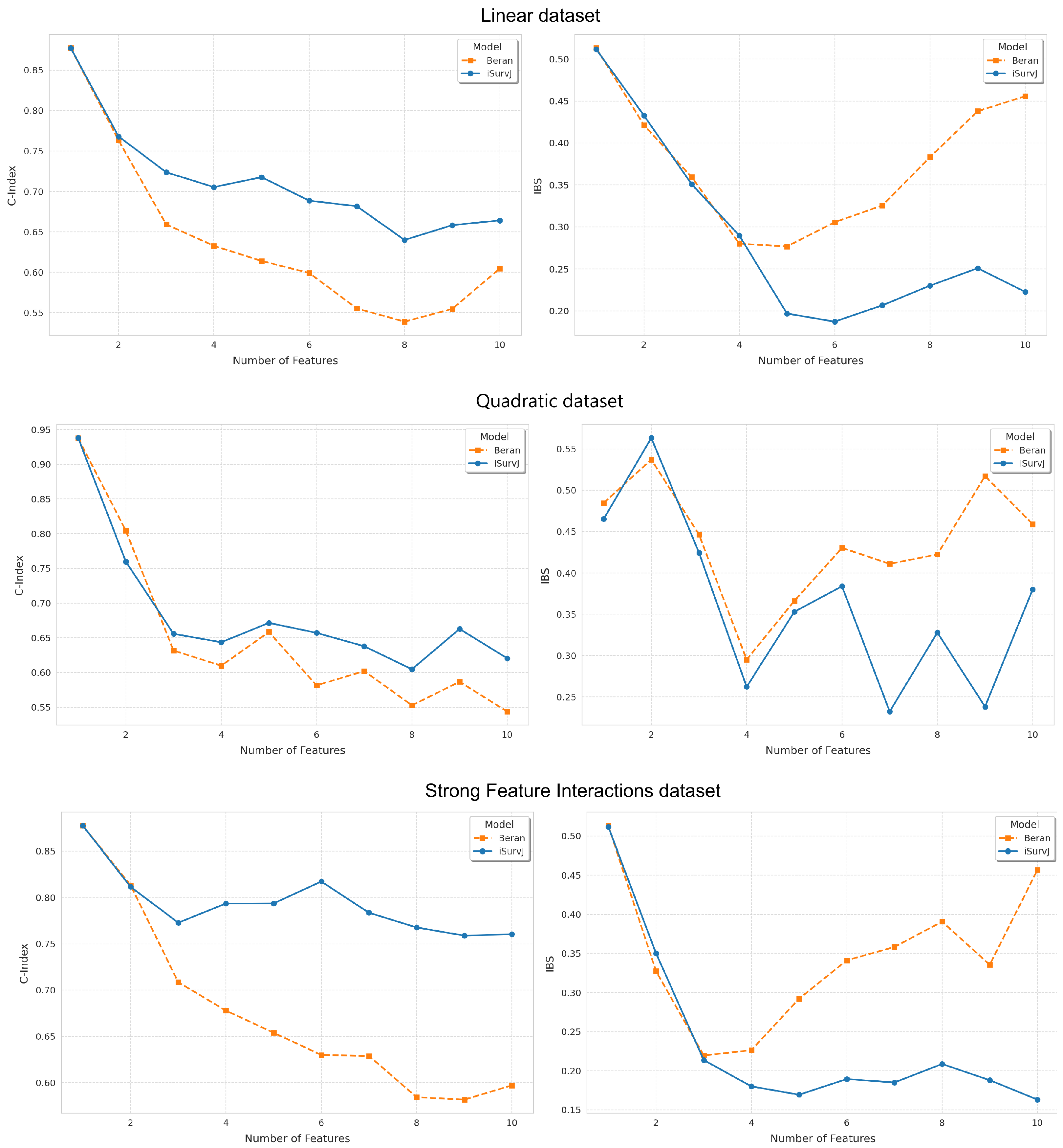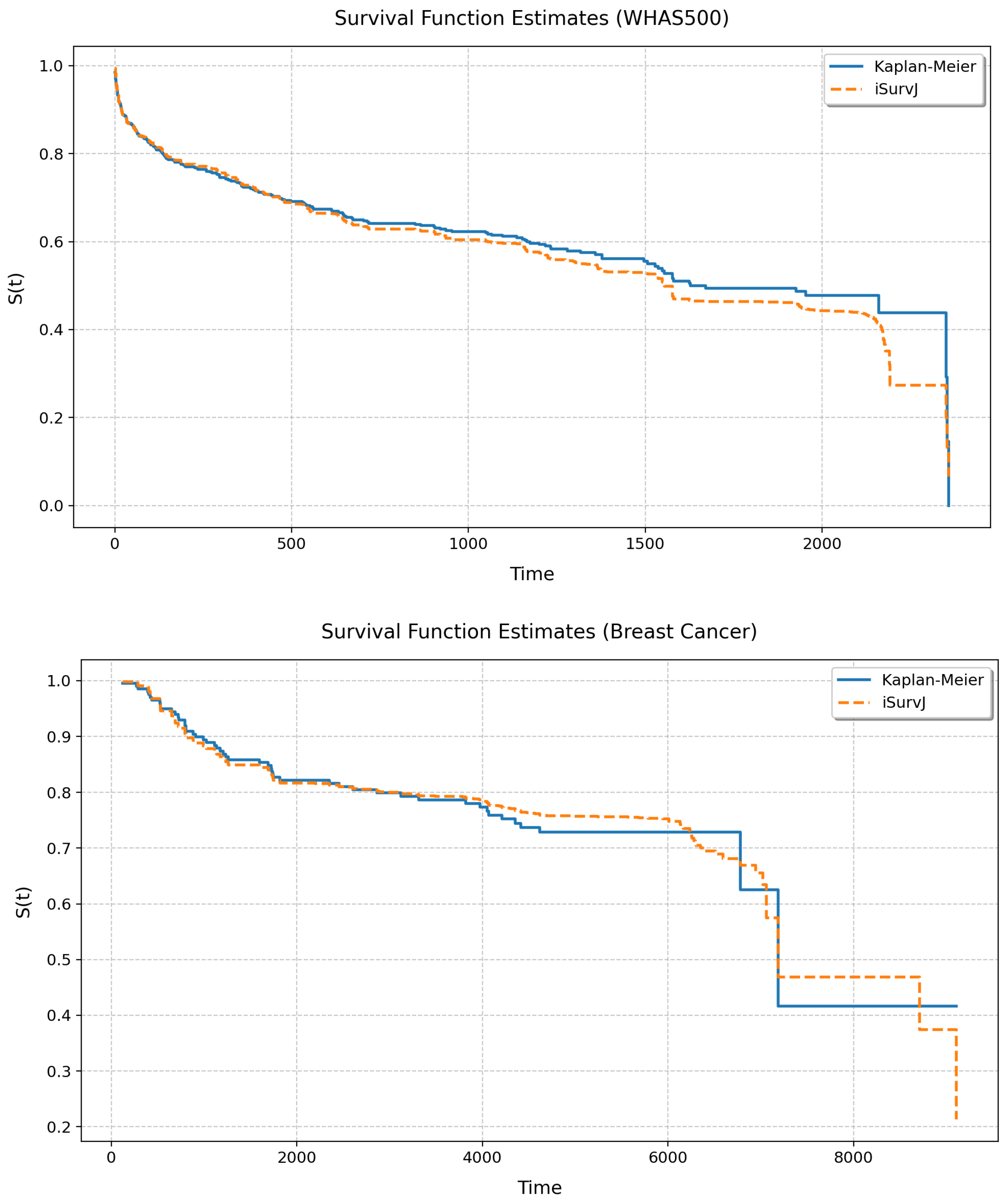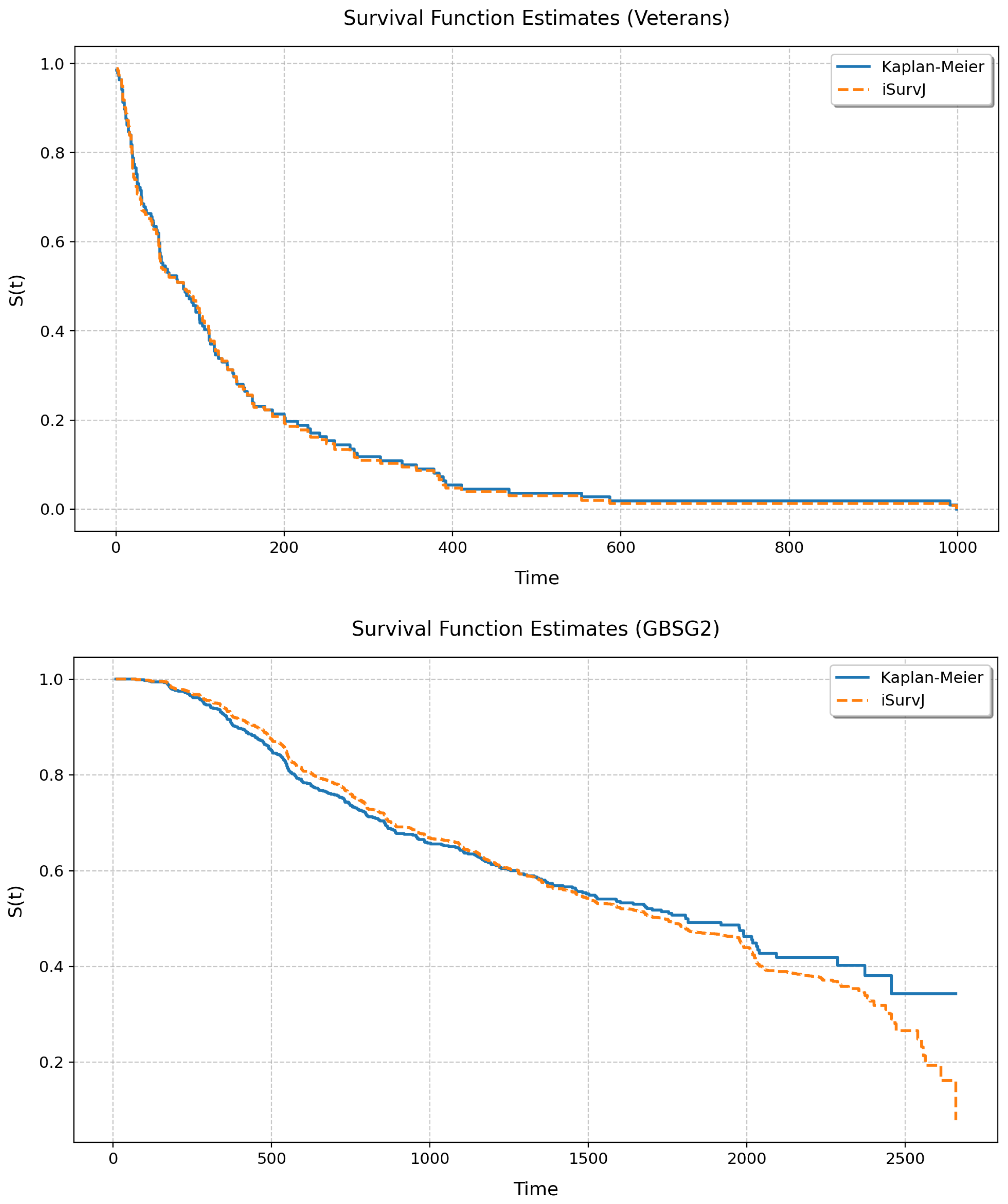 - Various numerical experiments with real and synthetic datasets are conducted to compare the proposed survival models with each other under different conditions and to compare them with the Beran estimator using the concordance index and the Brier score. We compare the proposed models with the Beran estimator, but not with available transformer-based models [16,41,42], because the introduced models are regarded as alternatives to the kernel-based Beran estimator and can be incorporated into a more complex model as a component. The corresponding codes implementing the proposed models are publicly available at: https://github.com/NTAILab/iSurvMQJ (accessed on 14 September 2025).