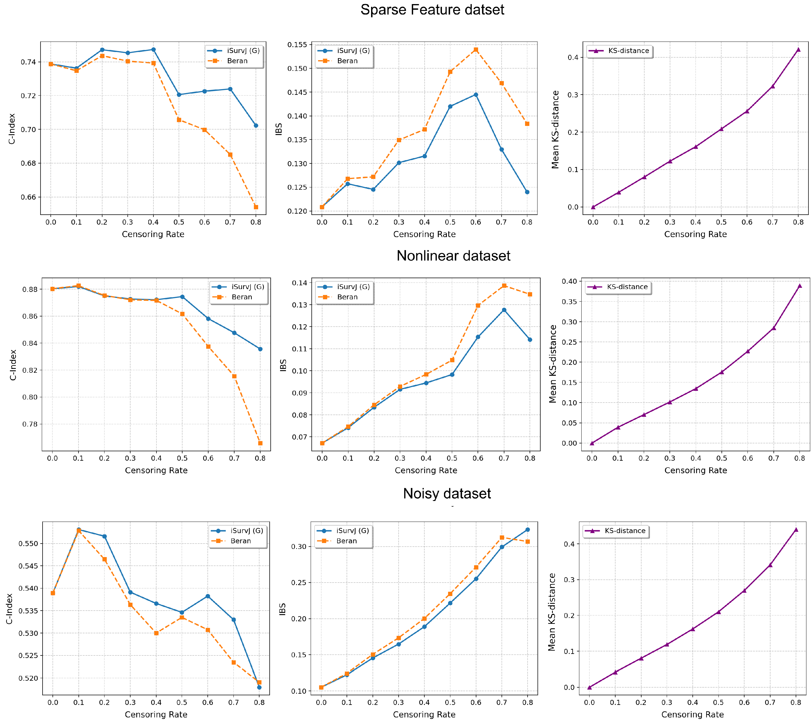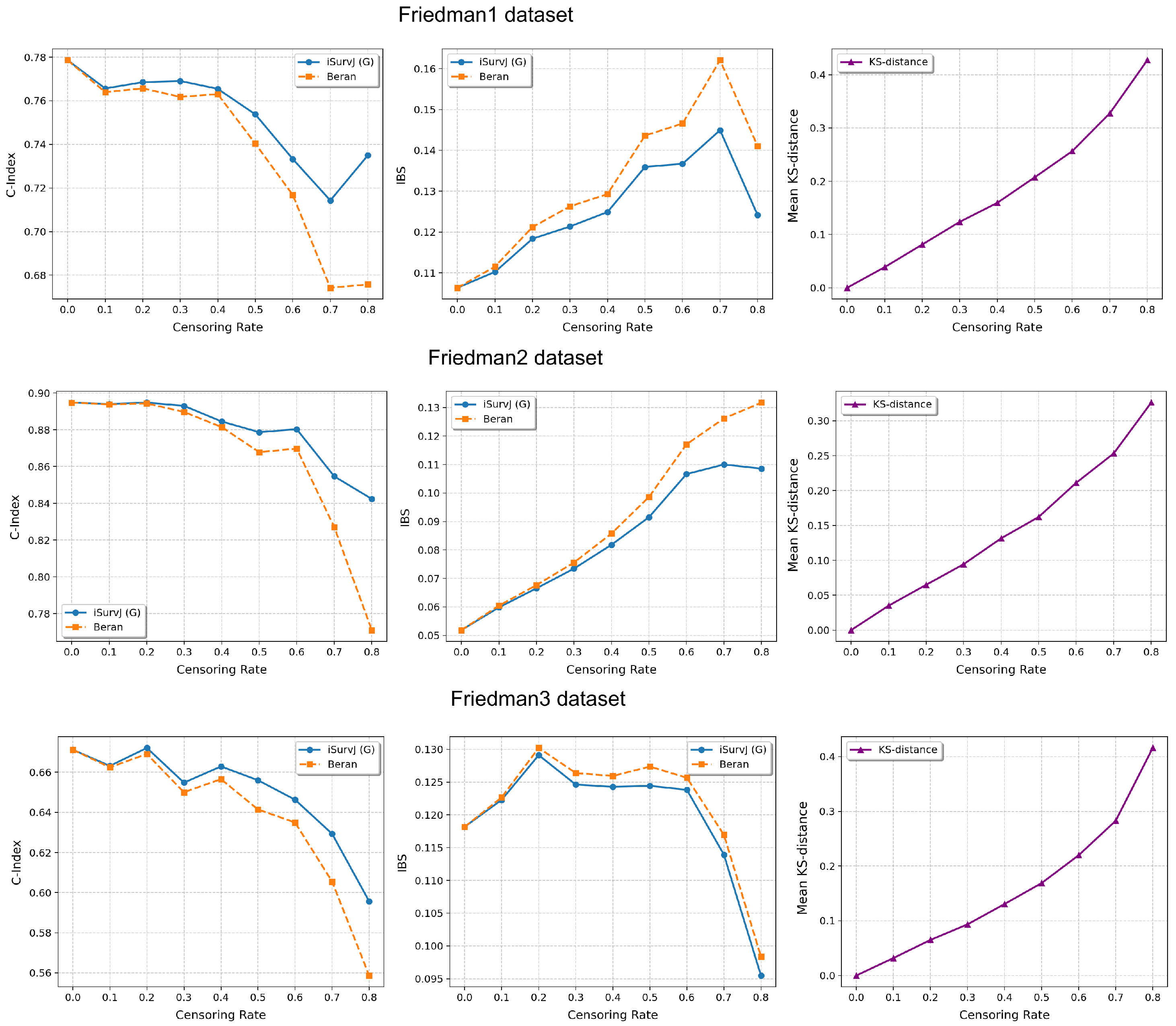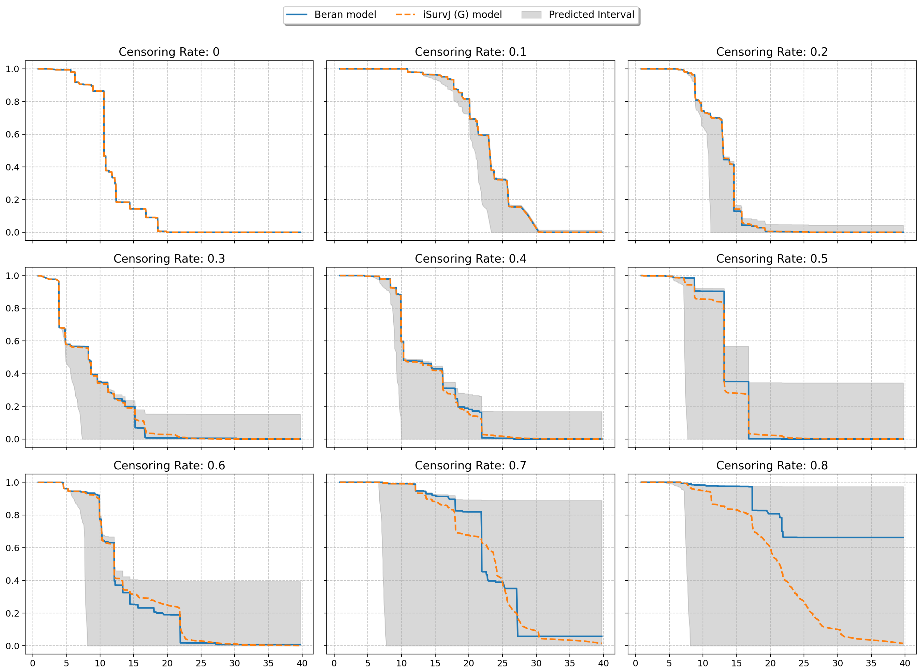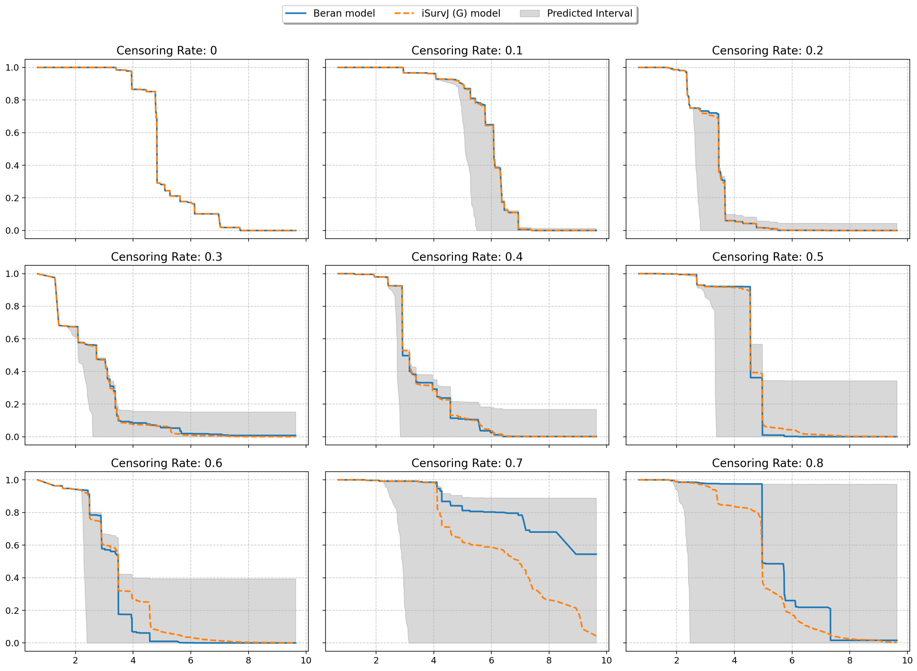 - Additionally, unlike Beran estimators, the proposed models impose no restrictions on the number of concurrent event times, making them more versatile. Moreover, a high proportion of censored data does not lead to significant accuracy degradation in the proposed models, unlike in Beran estimators.