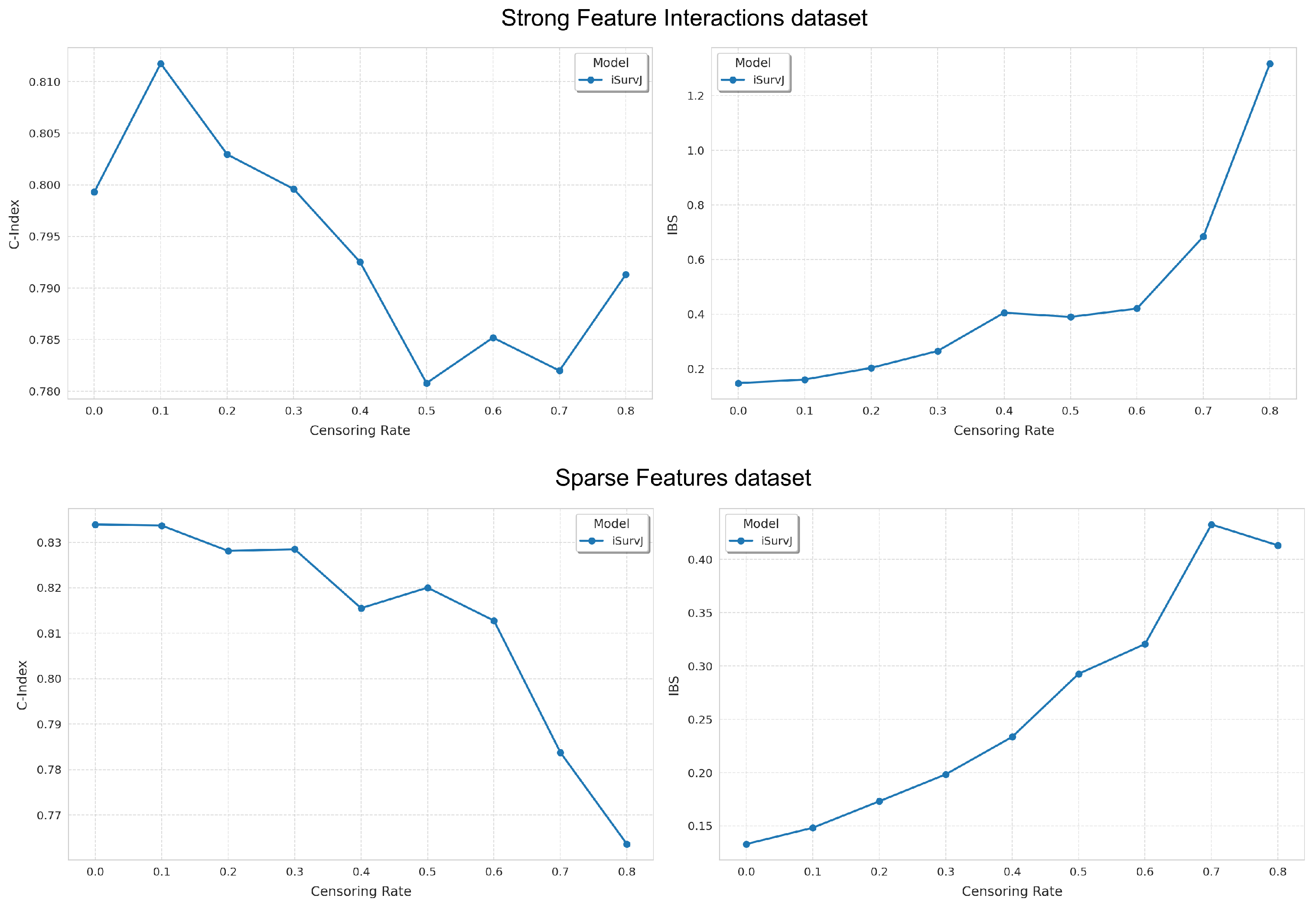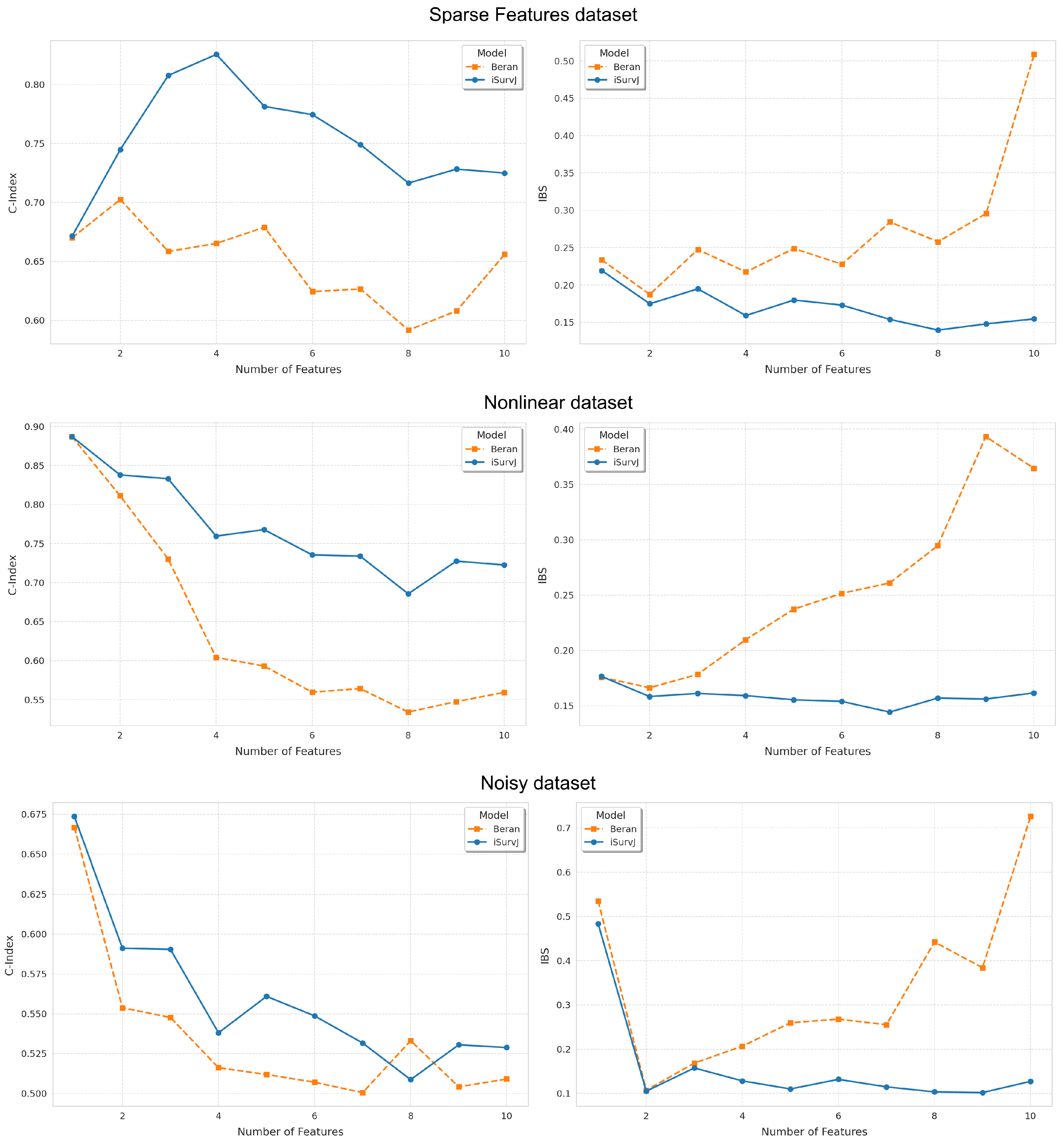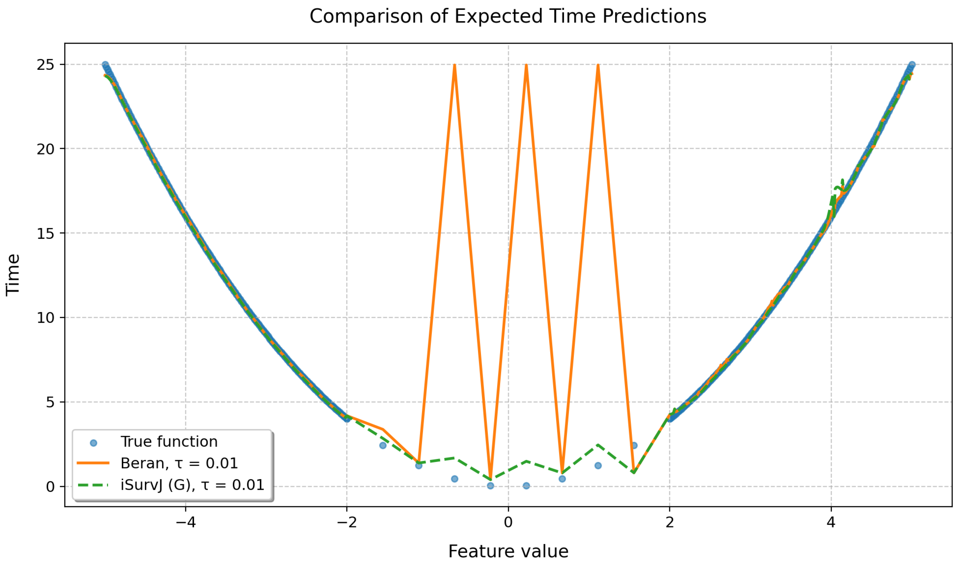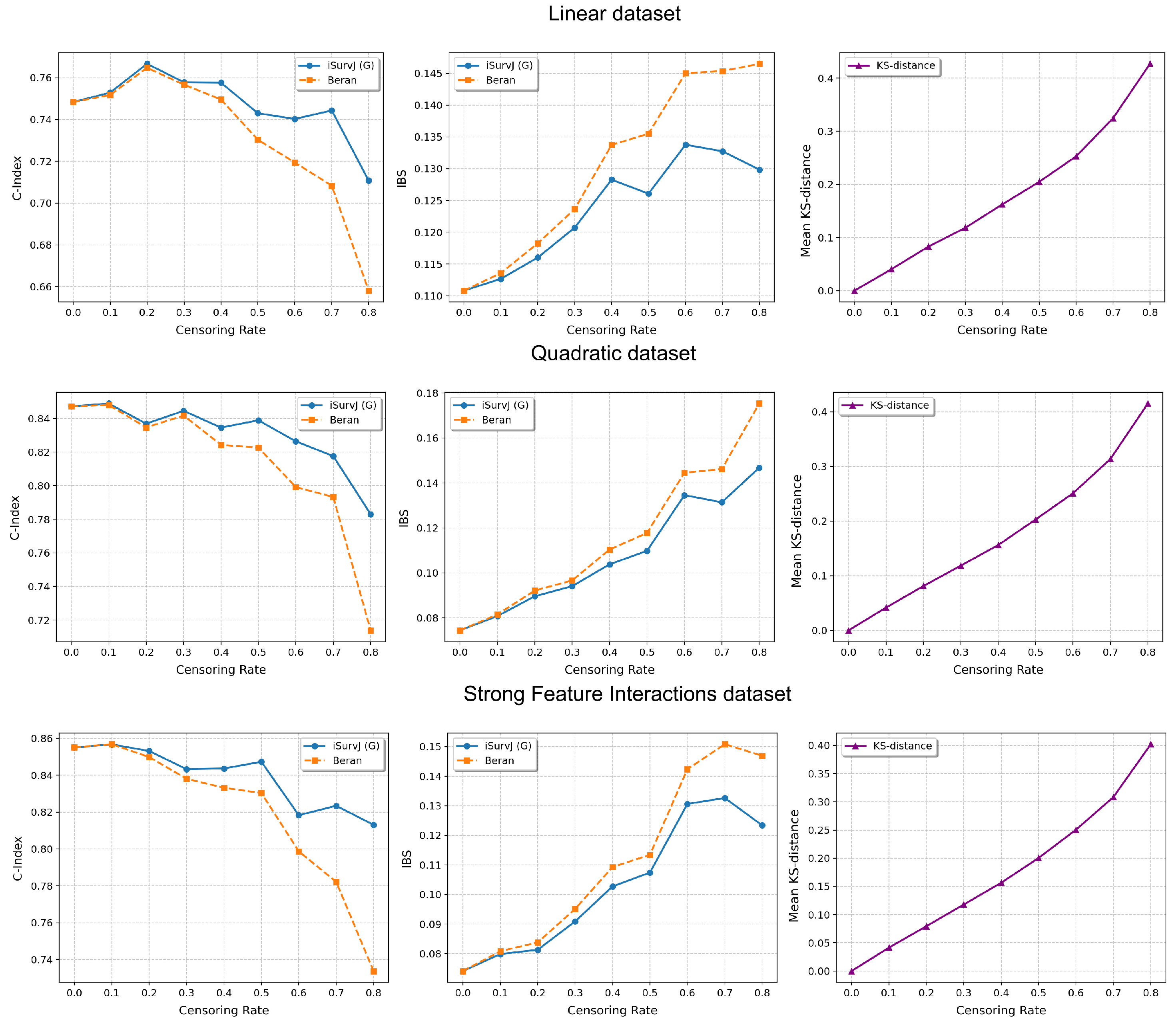 - Additionally, unlike Beran estimators, the proposed models impose no restrictions on the number of concurrent event times, making them more versatile. Moreover, a high proportion of censored data does not lead to significant accuracy degradation in the proposed models, unlike in Beran estimators.