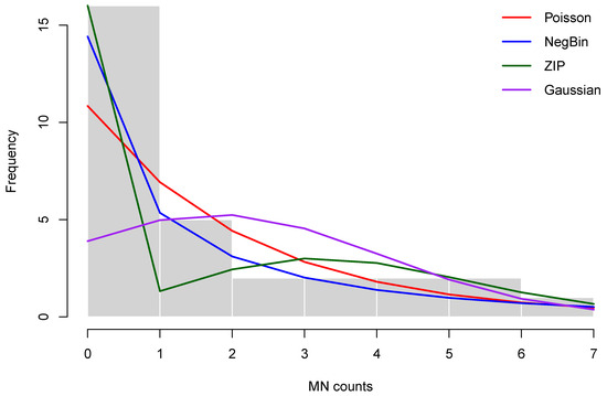 - Lehman, R.R.; Archer, K.J. Penalized Negative Binomial models for modeling an overdispersed count outcome with a high-dimensional predictor space: Application predicting micronuclei frequency. PLoS ONE 2019, 14, e0209923. [Google Scholar] [CrossRef]