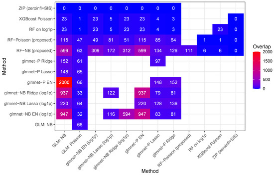 In stark contrast, nearly all other methods demonstrate profoundly unstable feature selection. The standard RF on log1p and XGBoost Poisson (while they are powerful predictive tools) show almost no overlap (a maximum of 23 genes), meaning their selected features change drastically with slight changes in the input data. This makes their results nearly impossible to interpret biologically, as there is no consistent genetic signature to investigate. Similarly, the various glmnet models (Lasso, EN, Ridge) exhibit low to moderate overlap, despite being designed for variable selection. Their instability in this high-dimensional, real-world setting suggests that they are highly sensitive to correlation and noise in genomic data, leading to inconsistent results. The ZIP model and classical GLMs fail entirely, identifying zero or negligible overlapping features, rendering their selections biologically uninterpretable.