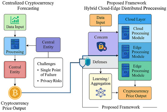 Overview of the proposed framework architecture and research motivation showing the challenges of centralized cryptocurrency forecasting systems versus the advantages of hybrid cloud–edge distributed processing.