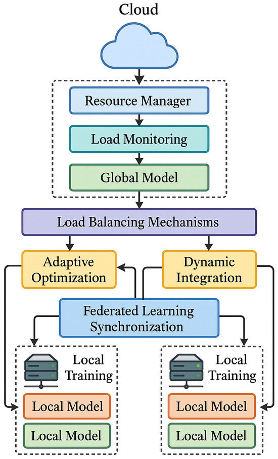 Dynamic integration and adaptive optimization strategy for coordinating cloud–edge resources, illustrating load balancing mechanisms and federated learning synchronization protocols.