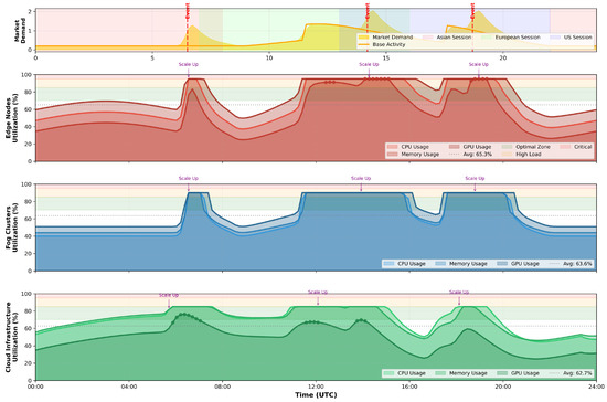 Hybrid cloud–edge architectures have been investigated in various domains, including IoT applications, autonomous vehicles, and smart cities [29,30]. In the financial domain, recent work by Hassan and Rodriguez [31] explored cloud–edge collaboration for high-frequency trading systems. Their architecture achieved significant latency reductions but was limited to traditional financial instruments and did not address the unique challenges of cryptocurrency markets.
