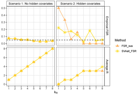 We first evaluated the two proposed strategies in terms of their ability to control the FSR. As illustrated in Figure 1, we compared the FSR and the number of truly relevant covariates R selected by the FSR_sva and SVAall_FSR methods. In Scenario 1, both strategies exhibited similar performance. In Scenario 2, however, their performance was less consistent: when the number of relevant covariates was small (), neither method adequately controlled the FSR. For larger numbers of relevant covariates (), FSR_sva effectively controlled the FSR and was more conservative than SVAall_FSR.