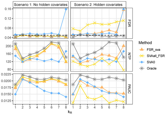 In Scenario 2, where hidden relevant covariates were present, the performance of the two integrated strategies was less optimal. The performance of SVA0 and Oracle was similar to that in Scenario 1, as these methods do not rely on the availability of observed explanatory variables. For , although both integrated strategies failed to control the FDR, FSR_sva was less liberal than SVAall_FSR. In contrast, for , SVAall_FSR outperformed both FSR_sva and SVA0. In terms of PAUC, FSR_sva showed the best overall performance among the three non-Oracle methods.
