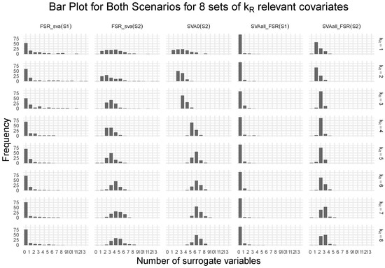 The figure shows the frequency distribution of the estimated number of surrogate variables for each of the three strategies across two simulation scenarios, based on 100 replications and eight different values of the number of relevant covariates .