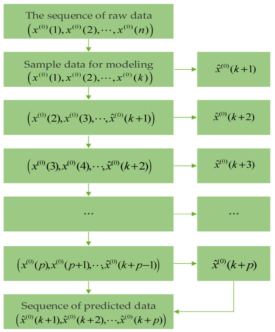 Assuming the scrolling window is set to four, only the latest four time-series data points are selected as modeling samples during modeling and prediction to establish a new GM (1,1). Then, the data within this small window are used to predict the next point, with only the most recent four points being taken as samples for each modeling step. This process is repeated continuously by sliding the window forward and updating the model, as illustrated in Figure 2.