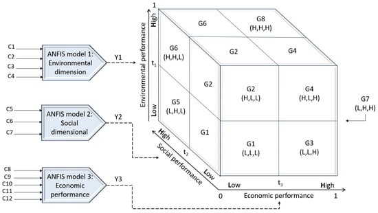 - G1 (L, L, L)—This group consists of the suppliers with the worst performance evaluations, or those with poor economic, environmental, and social performance. The suppliers in this group should be substituted if possible [53]. Otherwise, supplier development programs should be implemented to achieve improved supplier performance in the three dimensions of the TBL.