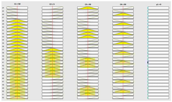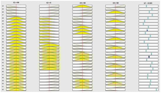 - Layer 4: This is the layer of the adaptive nodes that represents the rule consequents. These consequents generate outputs for each activated rule according to Equation (4). A linear function or a constant function can produce the consequent value. The output value of this layer is calculated by the simple product of the consequent of each rule () and the weight of the rule activated in the third layer.