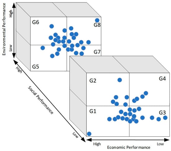 - G3 (L, L, H)—This group consists of suppliers with good economic performance and poor social and environmental performance. They operate their supply chains with a focus on profits and are not concerned with environmental and social issues.