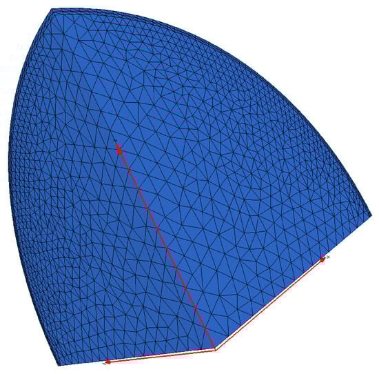 Figure 3 is a plot of the mesh of one-eighth of the spherical film/substrate system (three symmetry planes are used to obtain the entire spherical structure). The three symmetry planes allow the computational time to be reduced, resulting in a restriction to only symmetric bulking modes. The tetrahedron geometry of the mesh and the presence of smaller elements within the film part of the mesh are apparent in the figure. The spherical film/substrate geometry is meshed with two elements in the film thickness, having an average element , and it consists of 164,528 tetrahedra (689,358 degrees of freedom). We choose four different values of the parameter (0.2, 2.6, 4.9, 21.2); the mesh is the same for the four parameters.