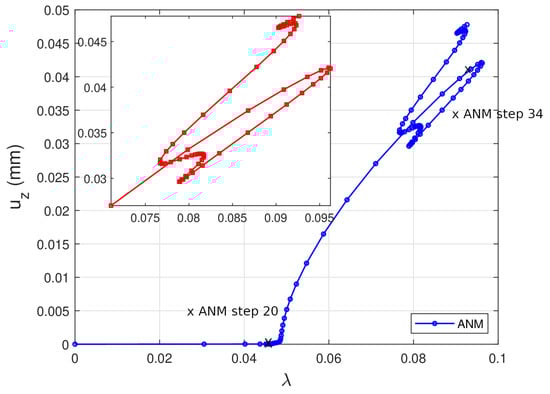 Plot of versus the vertical displacement of the center of the right face. Dots mark the end of ANM steps.