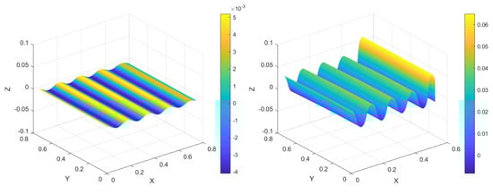 Film/substrate systems have already been studied with the help of ANM using a coupling between shell finite element (Büchter-Ramm []) and hexahedron finite elements by Fan Xu. In this section, we will present a numerical model with ANM using only a tetrahedron finite element (due to the FreeFEM++ implementation). As in Fan Xu’s research, we will assume geometrical nonlinear elasticity for the stiff film and linear elasticity for the soft substrate. The planes , are symmetry planes of the modeled film/substrate system (due to symmetry, only one-fourth of the structure is modeled). Moreover, on the interfaces and , the vertical displacements are assumed to be zero. The length, , width, , and height, of the film/substrate are, respectively, , , and . The thickness of the film, , is . The substrate and the film are assumed to be homogeneous isotropic and elastic materials. Young’s modulus of the substrate and the film are, respectively, and ). The Poisson ratios of the substrate and the film are, respectively, and . Since the Young’s modulus of the film is much larger than that of the substrate (), the substrate domain is assumed to have linear elasticity, while the film domain has nonlinear geometrical elasticity [].
