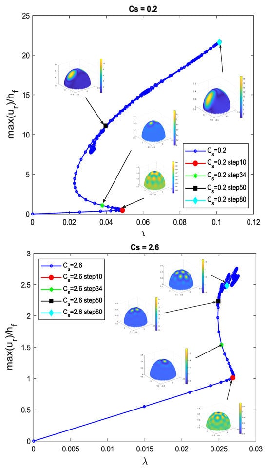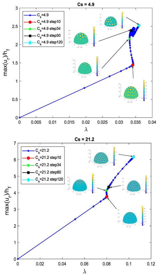 In this section, we study film/substrate systems with a spherical curvature for the case of a thermo-mechanical shrinkage of their compliant core. The details of the continuation algorithm ANM used to study thermo-mechanical problems were presented in Section 2.3. In [], Xu et al. presented an analytical model, experimental results, and numerical results. The numerical results were obtained with the commercial software ABAQUS using both the Riks method and the pseudo-dynamic method. Mechanical experiments have been made for spherical film/substrate systems in []. In order to characterize surface morphological pattern formation of core-shell spheres upon the shrinkage of the core, Xu et al. introduced the relevant parameter , where and are, respectively, the Young’s modulus for the substrate and the film. R the radius of the sphere (, including the film thickness), and the thickness of the film ().