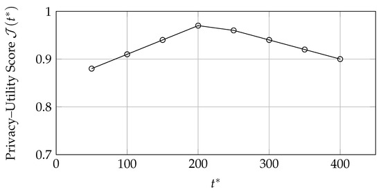 - Tunability: The degree of privacy protection can be finely adjusted by selecting the optimal reverse diffusion stopping point , determined through a formal privacy–utility optimization.