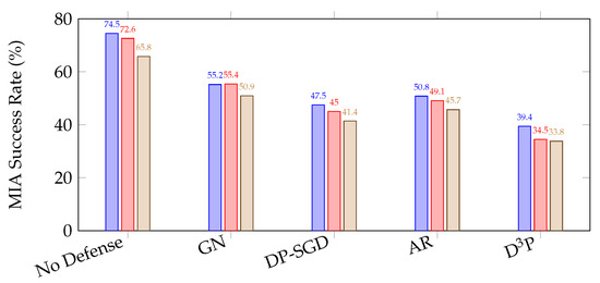 Against the adaptive MIA (Table 7), which incorporates calibration and feature augmentation, all defenses show reduced effectiveness compared to the standard MIA. However, D3P still achieves a point reduction, nearly 11 points better than the next-best defense (DP-SGD). This suggests that the structural obfuscation induced by partial denoising is difficult for adaptive attackers to circumvent. In the CelebA experiments (Table 8), D3P scales effectively to higher-resolution, visually complex inputs. It reduces MIA success rates by points while incurring only a point accuracy drop compared to No Defense. The scalability is partly due to the fact that the forward and reverse processes in diffusion models are resolution-agnostic once the network architecture is appropriately sized. Figure 5 visualizes the MIA success rates across all three new settings, reinforcing that D3P provides consistent and substantial privacy gains under diverse and challenging conditions.