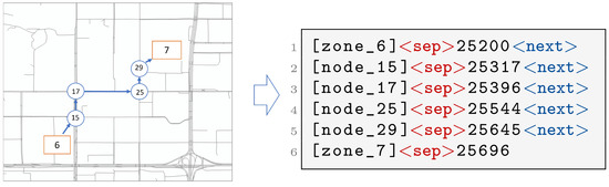 First, unique tokens are created for traffic zones and nodes by formatting their IDs as [zone_ <ID>] and [node_<ID>], respectively. This ensures each zone/node maps to a distinct token in the model’s vocabulary. Then, time information is converted into the total number of seconds in a day to form a continuous numerical representation, where, for example, 07:00:00 is encoded as 25,200 s. Finally, each spatial–temporal state along the route—comprising a zone/node ID and its corresponding timestamp—is then serialized using two special delimiters: <sep> to connect an entity ID with its timestamp and <next> to separate consecutive states. As shown in Figure 1, a route leaving zone 6 at 7:00 AM; passing through nodes 15, 17, 25, and 29; and arriving at zone 7 at 7:08:16 AM is encoded as shown below.