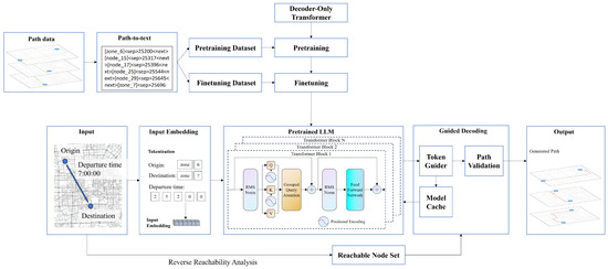 With the acceleration of urbanization, urban spaces continue to expand, and transportation networks exhibit characteristics of large scale, multi-level hierarchy, and complex connectivity. These complex networks give rise to intricate travel behaviors such as long-distance commuting and multi-modal transfers, posing challenges for modeling travel behaviors, particularly in path generation. Travel paths describe how travelers move from origin to destination over time and are represented by an ordered sequence of nodes, links, and timestamps within a transportation network. The goal of path generation is to convert travel demands—origin, destination, and departure time—into specific routes [1]. This process serves as the core component of travel behavior modeling and influences how traffic flow distributes over space and time [2]. Accurate path generation models support various applications: providing personalized navigation that aligns with real behavioral patterns [3], evaluating travel behaviors for transportation planning [4,5], or supplying accurate data for micro-simulations [6]. Consequently, path generation has attracted significant attention from researchers in network science and intelligent transportation domains [7].
