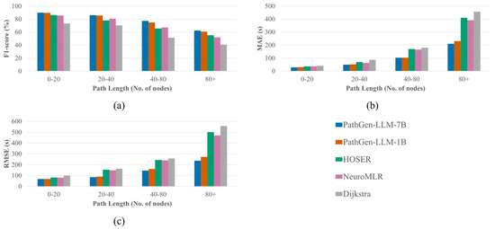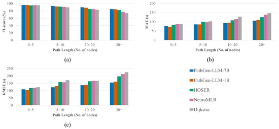 To evaluate the impact of path distance, we test the models’ F1-scores and travel time errors across different distance intervals, with results shown in Figure 3 and Figure 4. Figure 3 presents the results on the BJ-taxi dataset. PathGen-LLM outperforms all baselines across all distance ranges, demonstrating the proposed model’s superiority and stability. As path distance increases, the number of possible route branches grows, raising the complexity of path generation. Consequently, all models exhibit performance degradation with longer paths, but PathGen-LLM shows significantly slower decay. For short paths with fewer than 20 nodes, PathGen-LLM improves the F1-score by 3.31% over HOSER and reduces the RMSE by 13.28 s. However, for long paths exceeding 80 nodes, the F1-score improvement reaches 5.57%, while RMSE decreases by 229.08 s. This highlights PathGen-LLM’s advantage in generating long-distance paths. Comparing the two PathGen-LLM variants, the 7B version achieves greater performance gains on long paths than short ones, indicating that scaling up LLM parameters enhances long-sequence modeling capabilities more significantly.