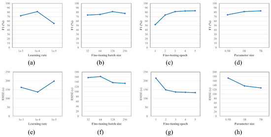 Effects of hyperparameters on the F1-score and RMSE: (a) Learning Rate (F1-Score); (b) Fine-Tuning Batch Size (F1-Score); (c) Fine-Tuning Epoch (F1-Score); (d) Parameter Size (F1-Score); (e) Learning Rate (RMSE); (f) Fine-Tuning Batch Size (RMSE); (g) Fine-Tuning Epoch (RMSE); (h) Parameter Size (RMSE).