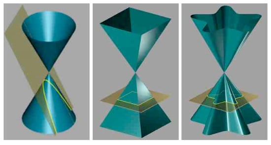 In cylindrical coordinates, a generalised cylinder is obtained, whose cross-sections can be circles, polygons, or starfish. They can change along the height of the cylinder, together with the changes in the parameter values in the n-tuple. An example is the stem of a cactus, which changes slightly in each cross-section. Figure 1 shows three double cones, whose cross-sections are defined by specific n-tuple of parameters (Equation (1)). The shape remains constant along the height but the size changes.