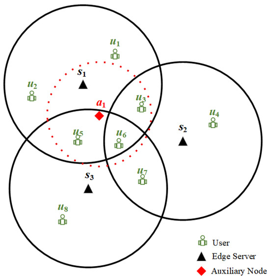 Based on the edge system, an auxiliary edge server, denoted as , is integrated to facilitate communication with users and offload requests, as shown in Figure 1. The auxiliary edge server can communicate with users , and . Consequently, these users are able to offload their requests to , thus reducing the load on the original edge servers that were processing these requests and adjusting the overall load distribution. It follows that the location and number of auxiliary edge servers affect the users they can communicate with, which in turn influences the overall load level. Therefore, examining the location and number of auxiliary edge servers is imperative if one is to determine the optimal placement and quantity for overall load balancing in the system.