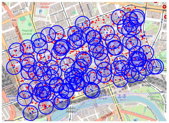 The experiments are carried out on a public benchmarking dataset, the EUA dataset. It contains 125 edge servers in the Melbourne CBD area in Australia, as shown in Figure 3. The dataset records the latitude and longitude of edge servers and users. It has been used extensively in existing studies. In alignment with the research scenarios for the A–ESD problem, user task data are synthesized following the Zipf distribution, and the communication radius and maximum load capacity of edge servers are defined in the experiment.