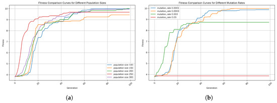In the experiment, the parameters are configured to achieve the optimal performance for the competing methods. The user task demand set Q was simulated based on Zipf’s law. The initial parameters were set as follows: , , , , and . The selection criteria for the initial population size and mutation rates are as shown in Figure 4a,b. We conducted 50 rounds of simulations on Dataset 1 and Dataset 2, respectively. Then, the average value was taken as the final experimental result.