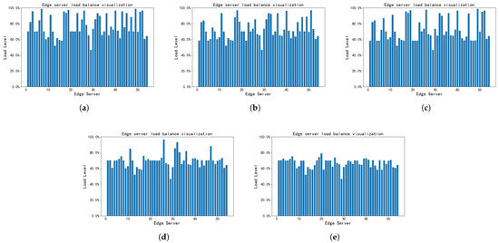 Visualization of edge-server load balancing by different methods. (a) No-Aux; (b) Random-B; (c) HE–GA; (d) Trad–GA; (e) LBA–GA.